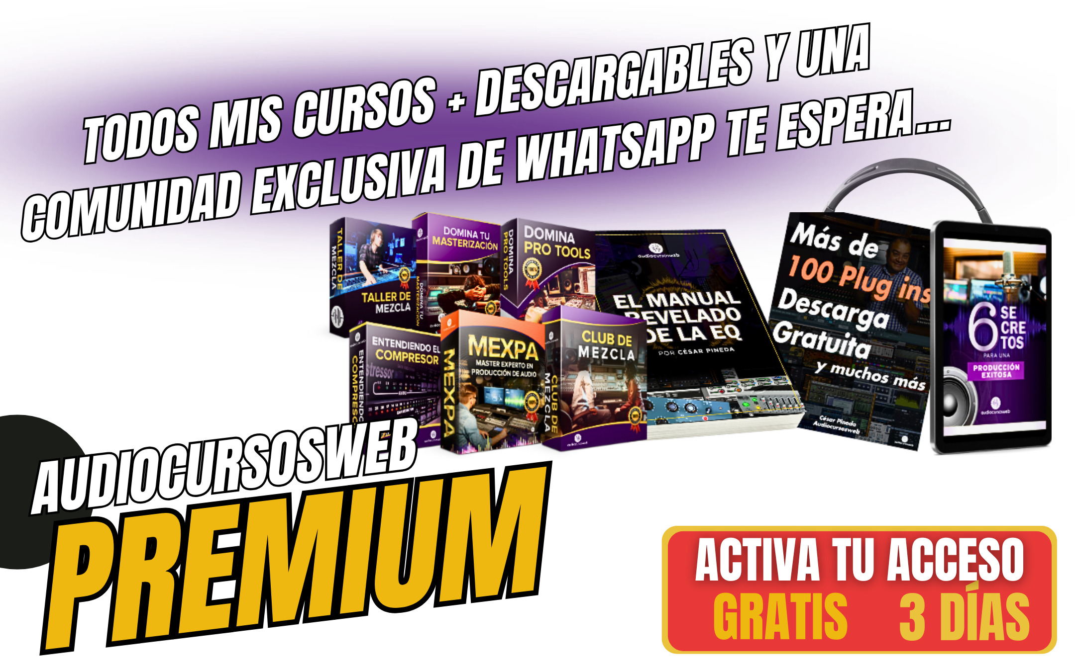 Audiocursosweb Premium es un ecosistema completo para dominar la producción de audio. Cursos avanzados, mentoría, recursos prácticos y una comunidad profesional que te guía paso a paso. Todo lo que necesitas para lograr resultados reales, en un solo lugar y en español.